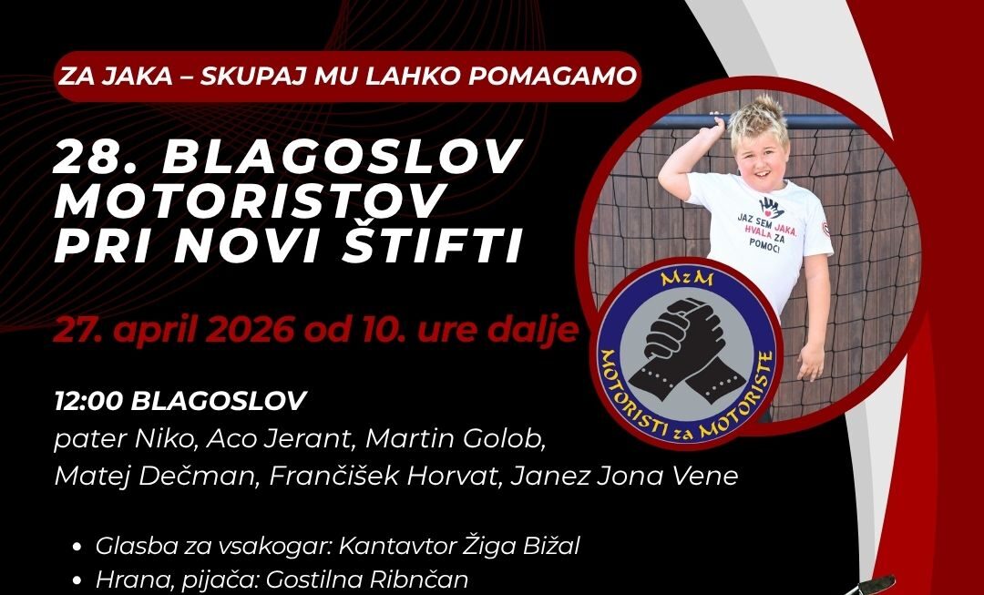 27. april 2026 od 10. ure dalje Tradicionalni 28. Blagoslov motoristov pri Novi Štifti bo letos potekal tudi dobrodelno, za Jaka – skupaj mu lahko